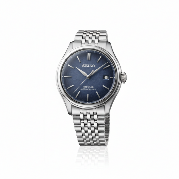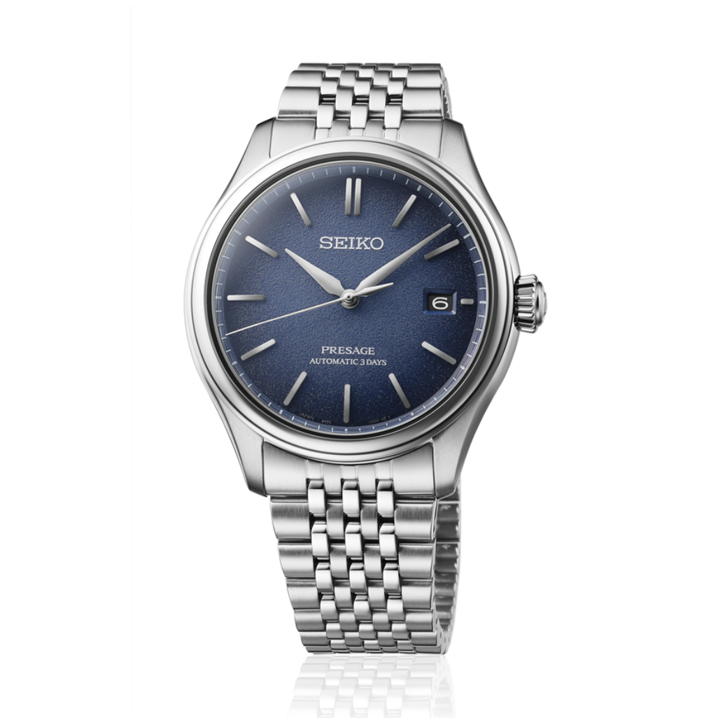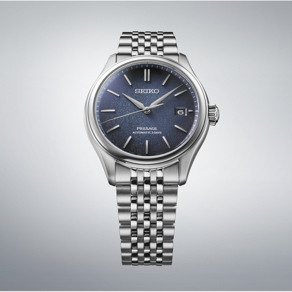 Gents Seiko Presage Classic Automatic Watch. The 40.2mm case and bracelet are stainless steel. The dial is blue with a textured pattern and a date function. The watch has a curved sapphire crystal glass, a see-through case back and is 100m water resistant. The movement is automatic with a 3-day power reserve.