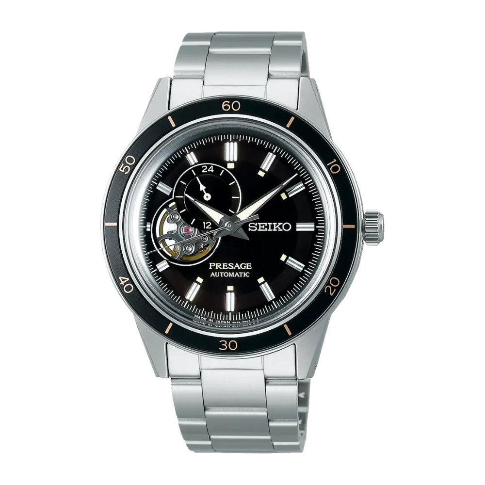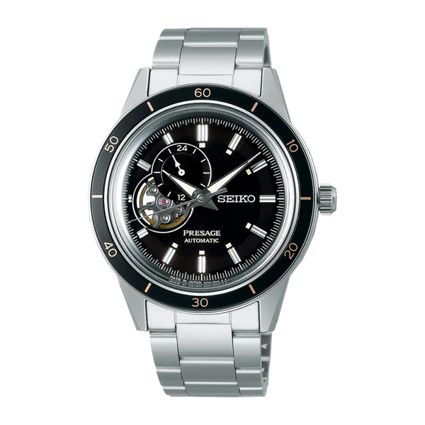 Gent's Seiko Presage Automatic Watch. The 40.8mm case and bracelet are stainless steel, the dial and bezel are black and the glass is hardlex crystal. The watch features a window on the dial revealing the automatic movement, a 24 hour hand indicator sub dial, and a see-through case back. Currently out of stock.