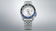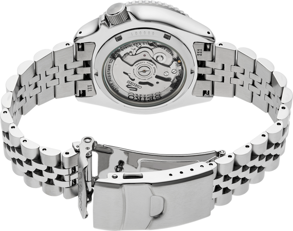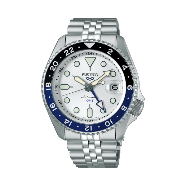 Gent's Seiko 5 Sports SKX Series Automatic GMT Watch. The 42.5mm case and bracelet are stainless steel. The bezel is blue and black and the dial is silver with a date function. The watch has a see-through case back and is 100m water resistant. The movement is automatic.