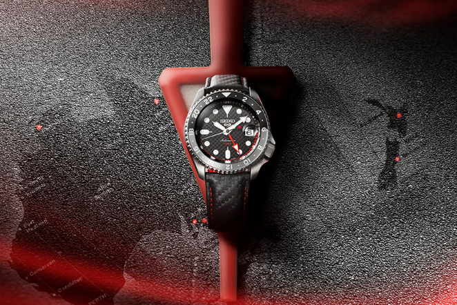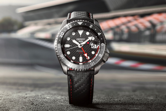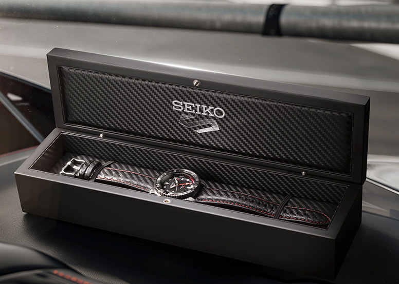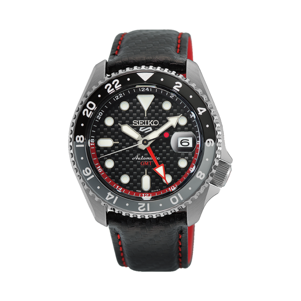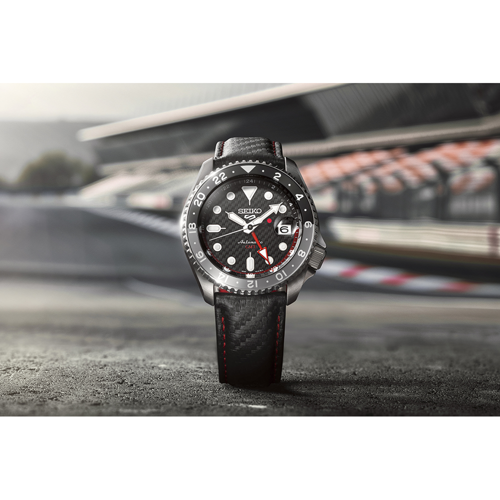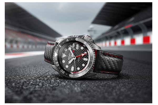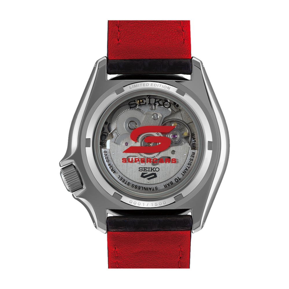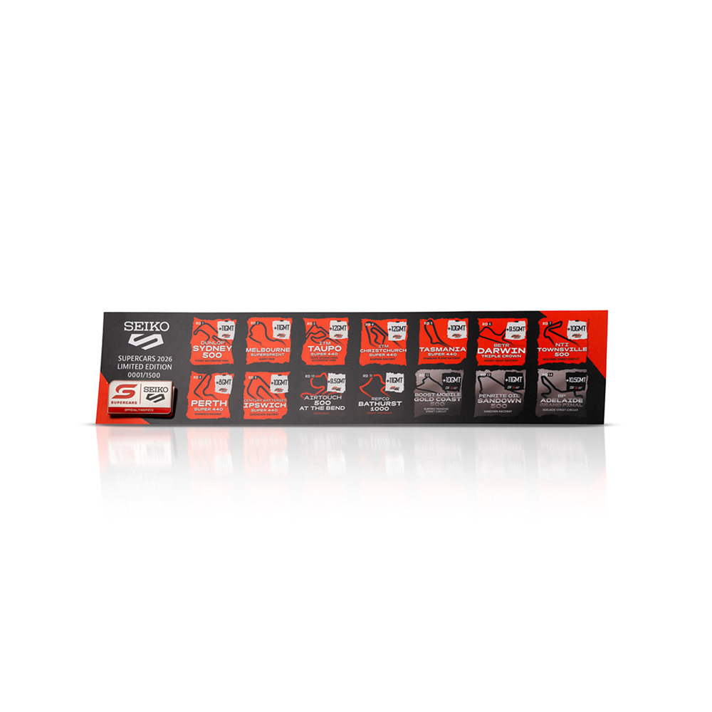 Arriving instore soon. Gent's Seiko 5 Sports Supercars 2026 Limited Edition. The stainless steel case is 42.5mm and the dial has a black carbon-fibre pattern with matching patterned leather strap. The watch has a GMT function and the Supercars logo is engraved on both the crown and case back, alongside each watch’s individual limited-edition numbering. Limited to just 1,500 pieces worldwide, this highly collectible model marks a major milestone as the first GMT watch ever released for the Supercars Championship.