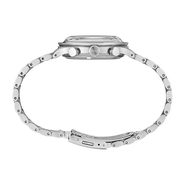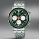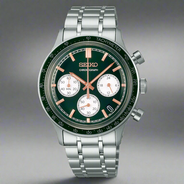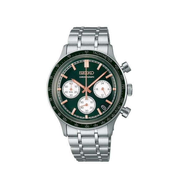 Gents Seiko Conceptual Chronograph Stainless Steel 38.7mm Case and Bracelet Green Dial with Three White Sub-Dials and Rose Coloured Accents Green Bezel with Tachymeter Scale 24-hour hand Indicator Date 100m Water Resistant Quartz Watch.