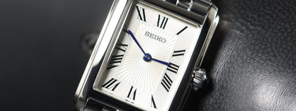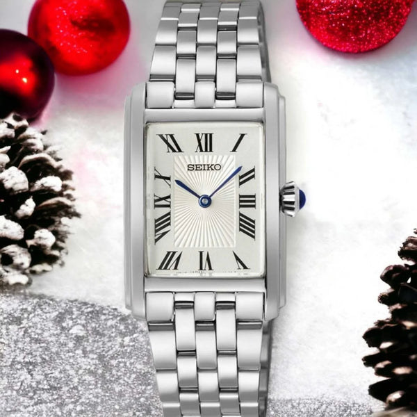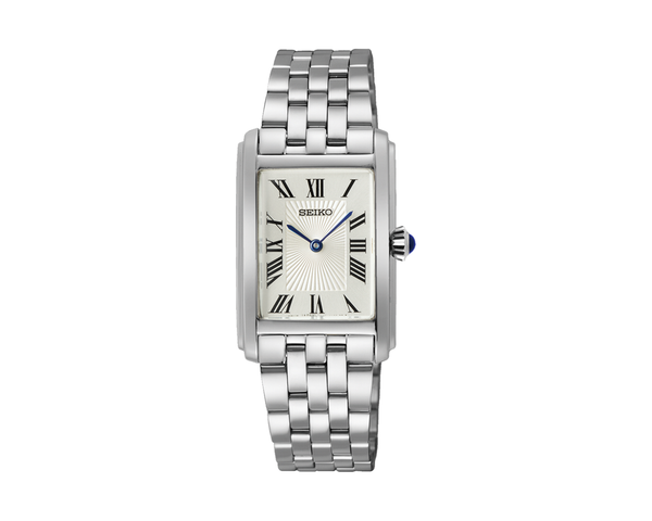 Ladies Seiko Conceptual Stainless Steel 22.2mm Diameter Rectangular Case and Bracelet Silver Patterned Dial with Black Roman Numerals and Blue Hands Quartz Watch.