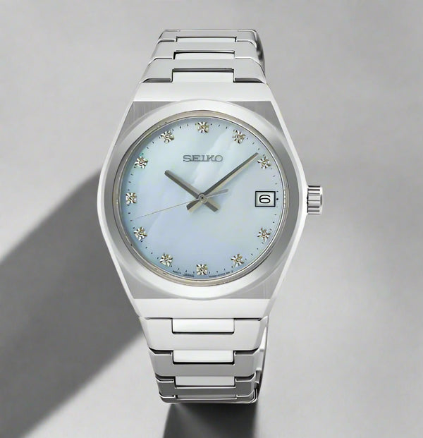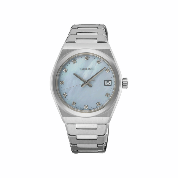 Ladies' Seiko Conceptual Stainless Steel 34mm Case and Bracelet Light Blue Mother-of-Pearl Dial with Eleven Diamond Set Hour Markers Date Sapphire Crystal Glass 100m Water Resistant Quartz Watch.