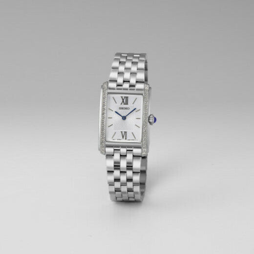 Ladies Seiko Stainless Steel Rectangular 22.7 x 33.1mm Case and Bracelet Silver Coloured Dial Bezel set with Crystals Quartz Watch.