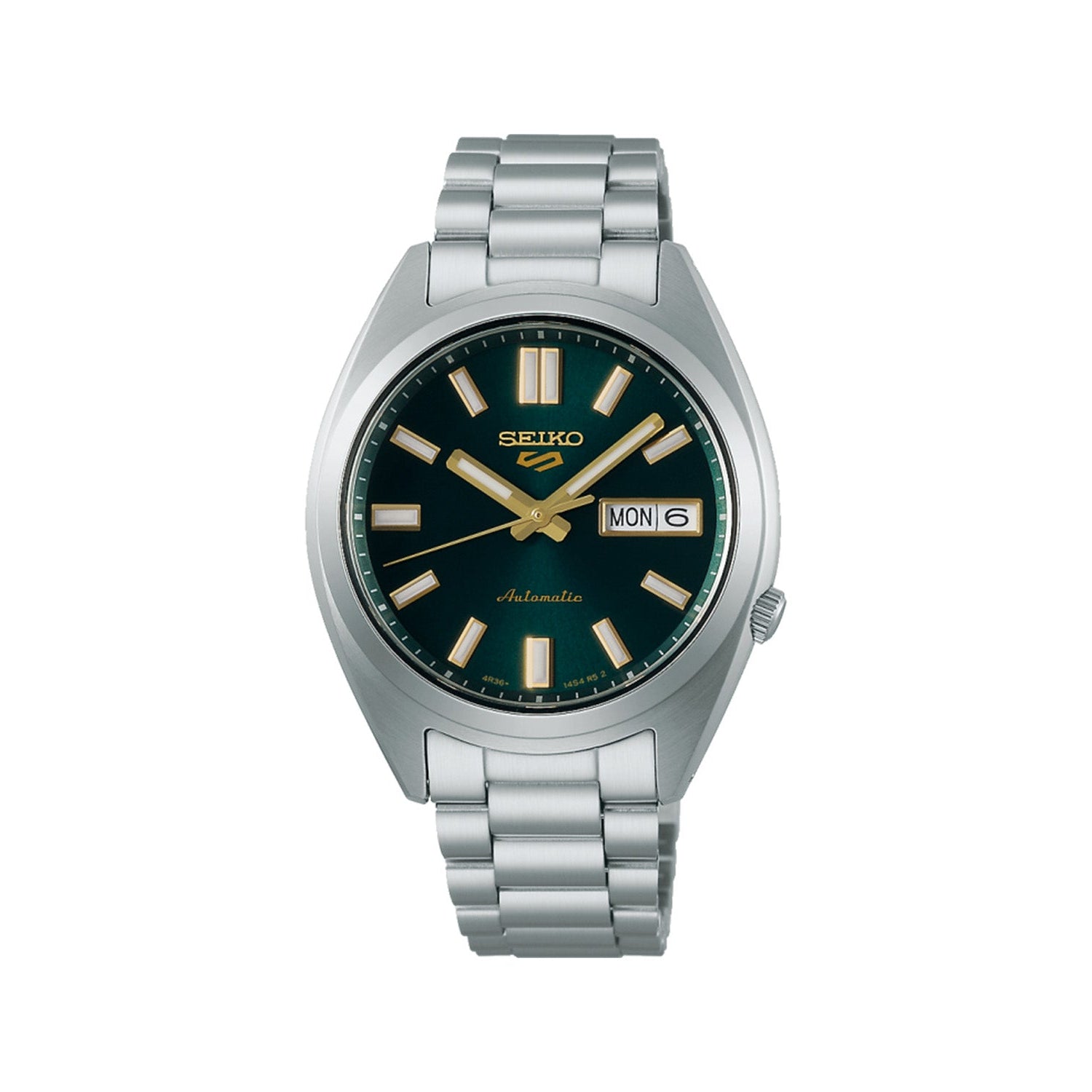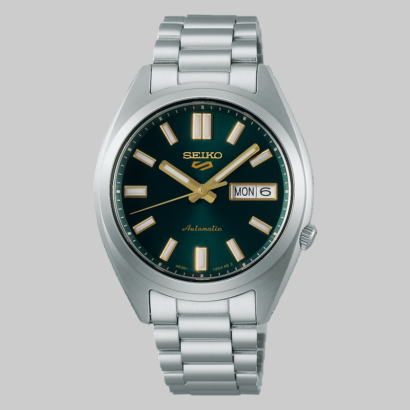 Seiko 5 Sports SNXS Series 37.4mm Stainless Steel Case and Bracelet Green Dial Day/Date Function See-Through Case Back 100m Water Resistant Automatic Watch.