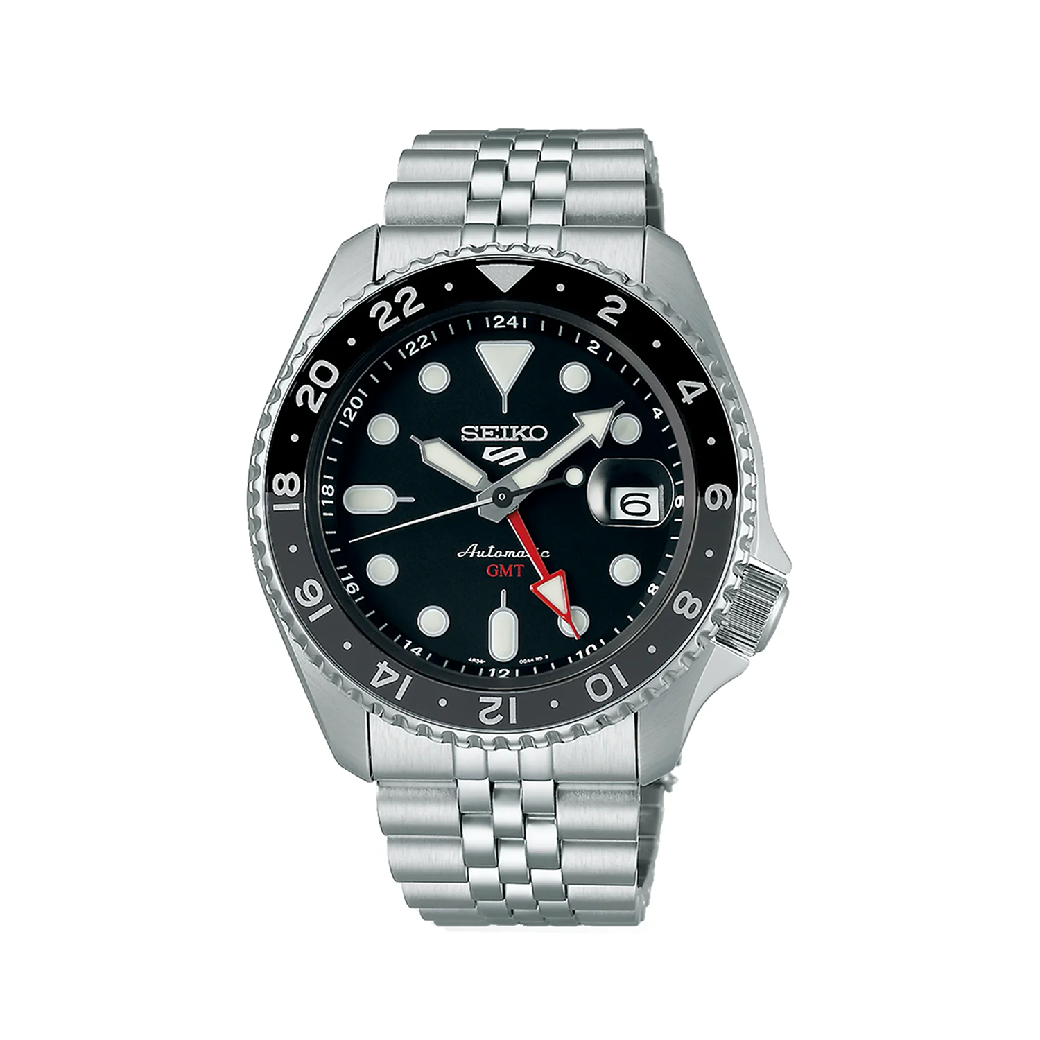 Gent's Seiko 5 Sports Automatic GMT Stainless Steel 42.5mm Case and Bracelet, Black Dial and Black Bezel Transparent Case Back 100m Water Resistant Day Date Watch. Currently out of stock.
