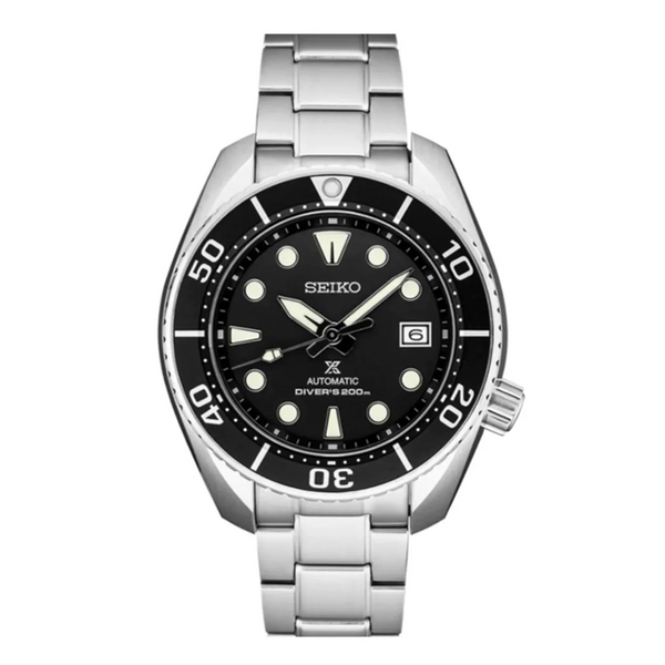 Gent's Seiko Prospex Diver's 200m Automatic Watch. The 45mm case and bracelet are stainless steel and the bezel is black. The dial is black with a date function. The glass is sapphire crystal. The watch is 200m water resistant. The movement is automatic. Currently out of stock. Currently out of stock.