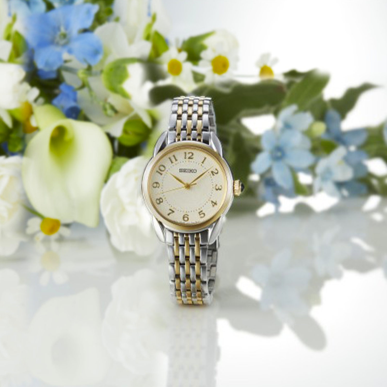 Ladies Seiko Conceptual Bicolour: Yellow Gold PVD and Stainless Steel 28.7mm Case and Bracelet Off White Dial with Gold Coloured Arabic Numerals Quartz Watch.