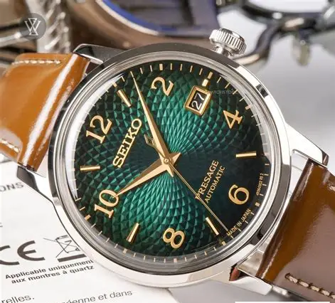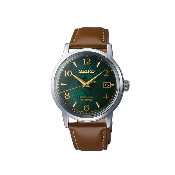 Gent's Seiko Presage 38.5mm Stainless Steel Case with Brown Leather Strap and Stainless Steel Deployment Clasp Green Dial with Gold Coloured Batons and Arabic Numerals See-Through Case Back Date Automatic Watch.