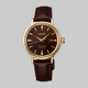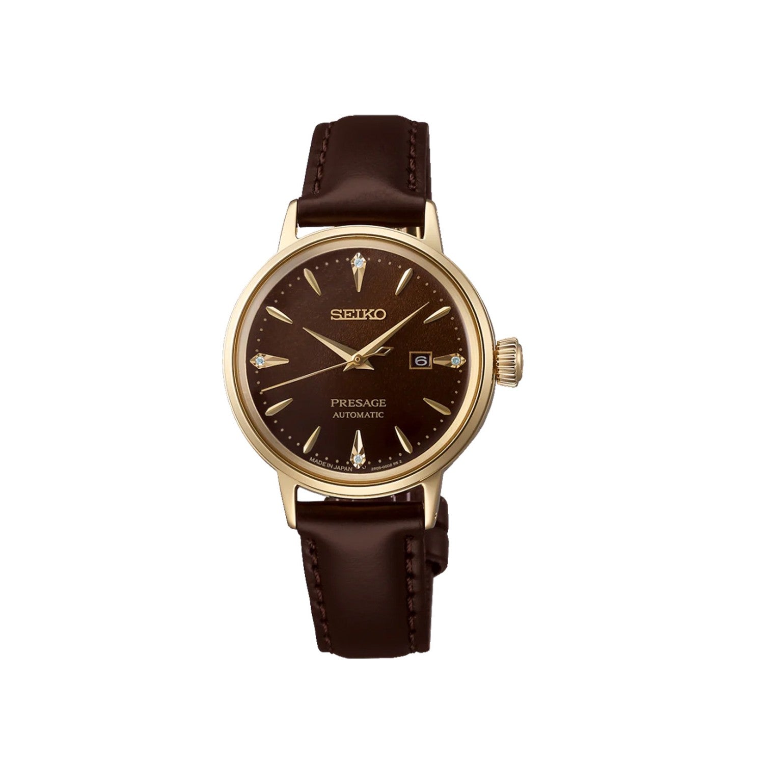 Ladies' Seiko Presage Cocktail Time Automatic Watch. The 30.3mm case is yellow gold PVD on stainless steel and the strap is brown leather with a deployment clasp. The dial is brown with a textured finish and four diamond set hour markers. The watch has a date function. The movement is automatic.