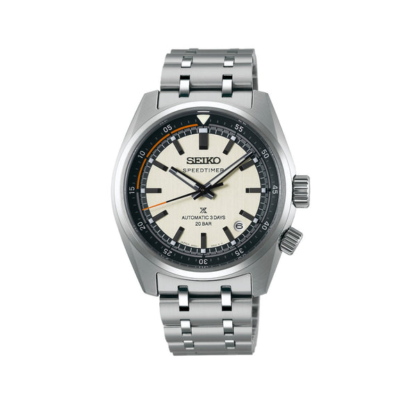 Gent's Seiko Prospex Speedtimer Automatic Watch. The 39.5mm case and bracelet are stainless steel. The dial is cream with a date function. The watch has a countdown timer function with a rotating inner ring. The glass is a curved sapphire crystal. The watch has a see-through case back and is 200 metres water resistant. The movement is automatic.