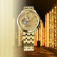 Gents Seiko Presage Japanese Garden Automatic Watch. The 41.8mm case and bracelet are yellow gold PVD on stainless steel. The dial is gold with a textured pattern, gold coloured roman numerals and hands, 24-hour indicator sub-dial and circlular shaped movement window. The watch has a sapphire crystal glass with a see-through case back. The movement is automatic.