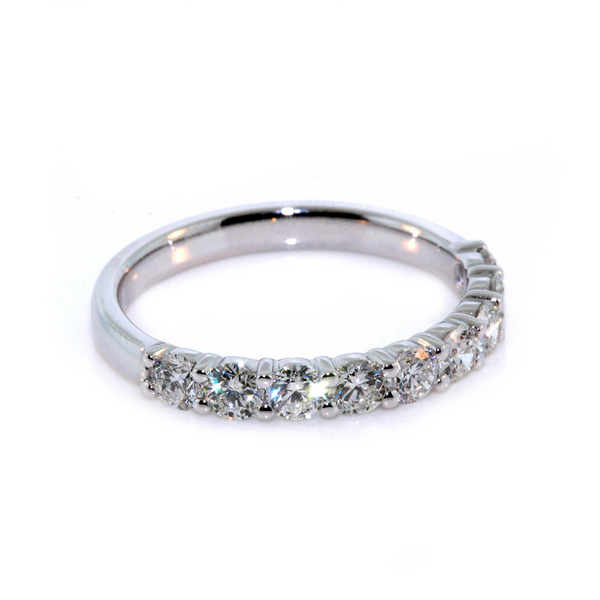 Ladies platinum diamond set wedding / eternity ring, claw set with 1ct of round brilliant cut diamonds, quality FG/VS1-2. This ring is made to order in the required finger size.