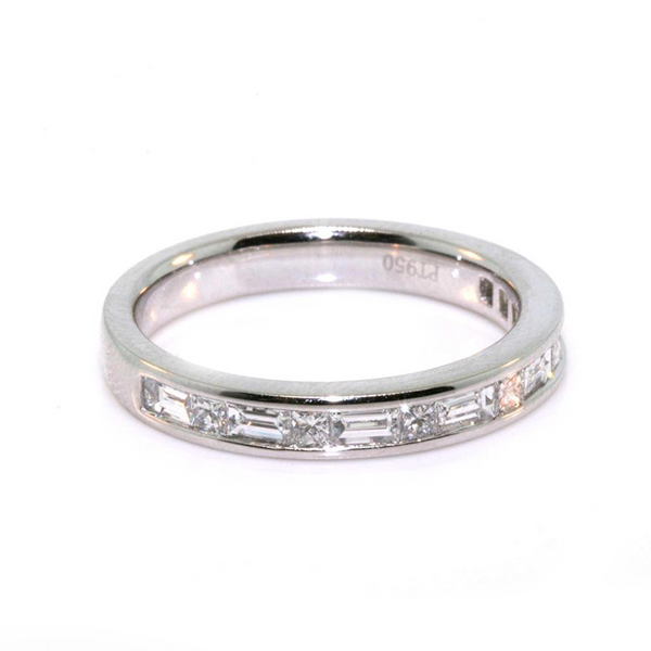 Ladies platinum diamond set wedding / eternity ring. The ring is set with 0.44cts of baguette cut and 0.21cts of princess cut diamonds, quality FG / VS1-2.