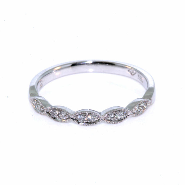Lades 18k white gold diamond set shaped wedding / eternity ring. The ring is set with 0.12cts of round brilliant cut diamonds into marquise shaped settings, quality GH / SI1-2.