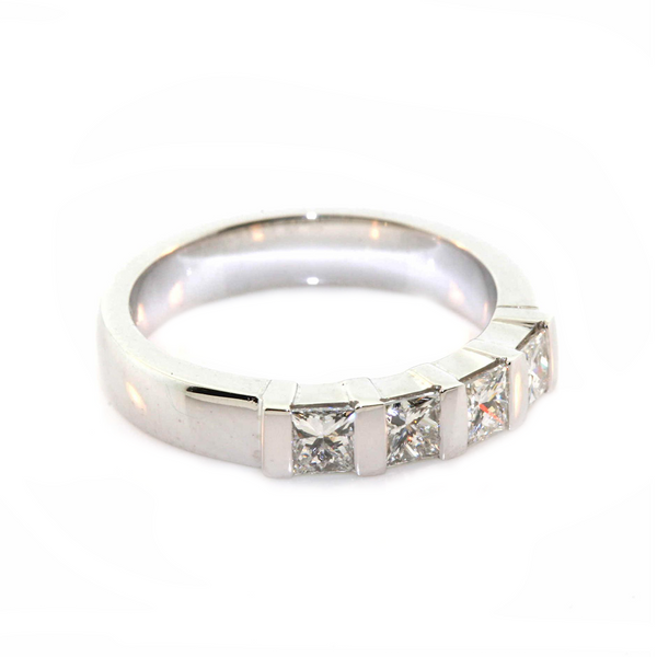 Ladies platinum diamond set wedding / eternity ring. The ring is set with four princess cut diamonds with a total weight of 0.65cts, FG/VS1-2. This design is made to order in the required finger size.  Pricing is based on finger size M-N.