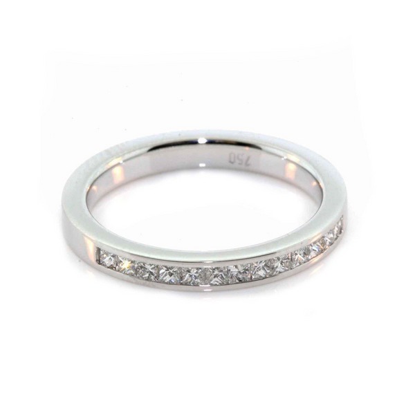 Ladies Handmade 18k white gold diamond set wedding ring. The ring is 2.5mm wide and is set with 0.30cts of princess cut diamonds, quality FG / VS-SI.  This ring is made to order in the required finger size. Pricing is based on finger size L-M.
