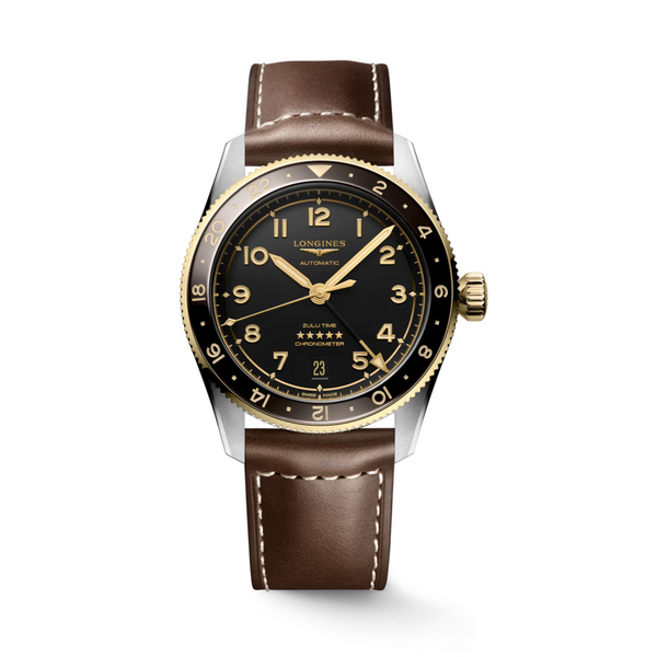 Gents Longines Spirit Zulu Time GMT Automatic Chronometer Watch. The 39mm case is stainless steel. The bezel is 18k gold capped with a brown ceramic insert. The strap is brown leather with a stainless steel deployment clasp. The dial is anthracite colour with arabic numerals. The glass is sapphire crystal. The watch features a 24 hours hand with a time zone mechanism and a date function. The watch is 100m water resistant. The movement is an automatic chronometer.