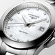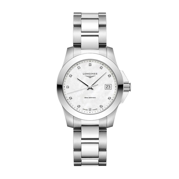 Ladies Conquest Quartz Watch. The case and bracelet are stainless steel, the dial is white mother-of-pearl and the glass is sapphire crystal. The watch features diamond set hour markers and is 300 metres water resistant. Currently out of stock.