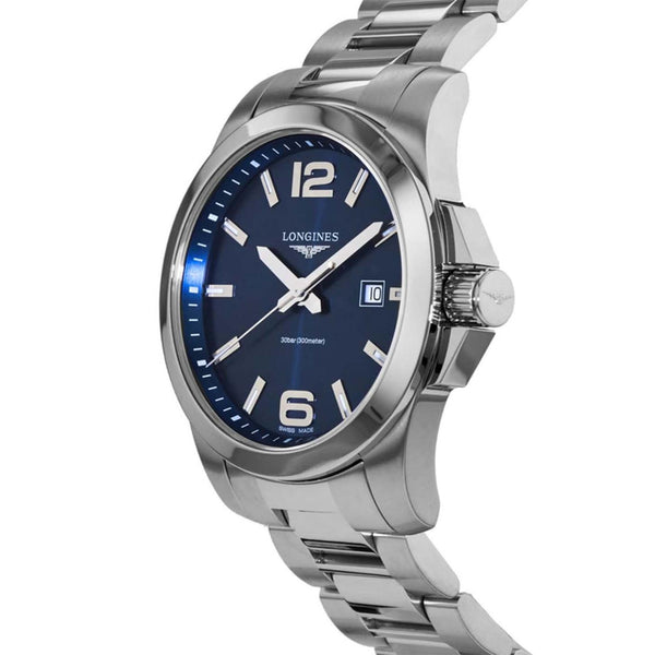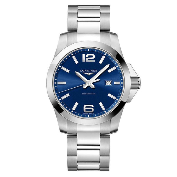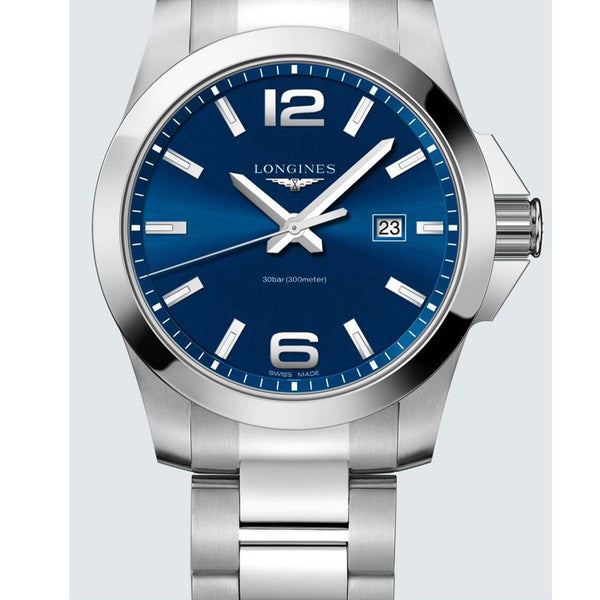 Gent's Longines Conquest Quartz Watch. The 43mm case and bracelet are stainless steel, the dial is blue and the glass is saphire crystal. The watch features a date function. The watch is 300 metres water resistant and the movement is quartz. Currently out of stock.