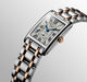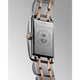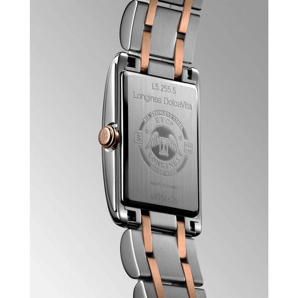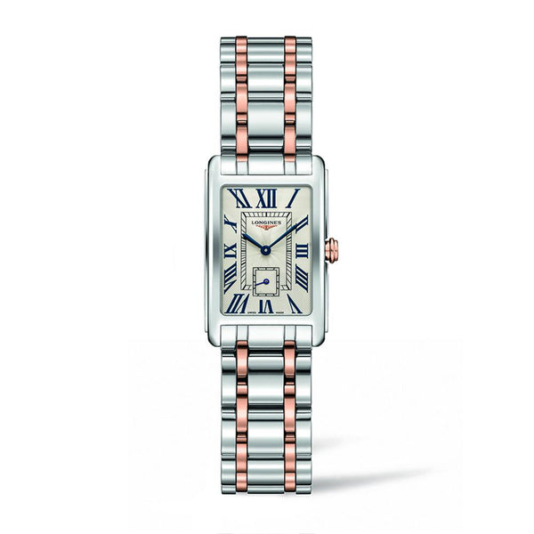 Ladies' Longines Dolce Vita Bicolour Quartz Watch. The rectangular 20.8 x 32mm case is stainless steel with an 18k pink gold crown.The bracelet is bicolour: stainless steel and 18k pink gold capped links. The silver flinqué dial has black roman numerals, blue hands and a small seconds had sub-dial. The glass is sapphire crystal. The movement is quartz. Currently out of stock but a new piece is expected to arrive instore soon.