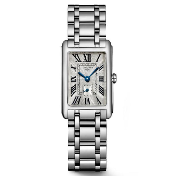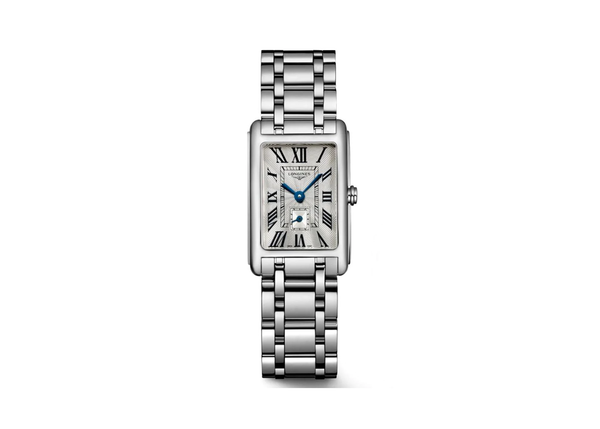 Longines Dolce Vita Quartz Watch. The 20.8mm x 32mm case and bracelet are stainless steel, the dial is silver flinque and the glass is sapphire crystal. The watch features a second hand sub dial. The movement is quartz. Currently out of stock but a new piece is expected to arrive instore soon.