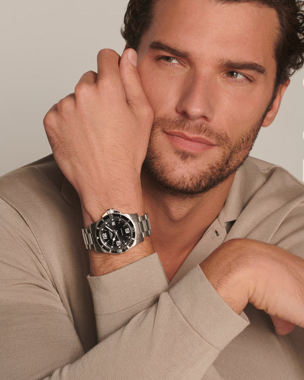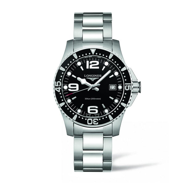 Gent's Longines Hydro Conquest Quartz Watch. The 41mm case and bracelet are stainless steel, the dial and bezel are black and the glass is sapphire crystal. The watch features a date function. The watch is 300 metres water resistant and the movement is quartz.