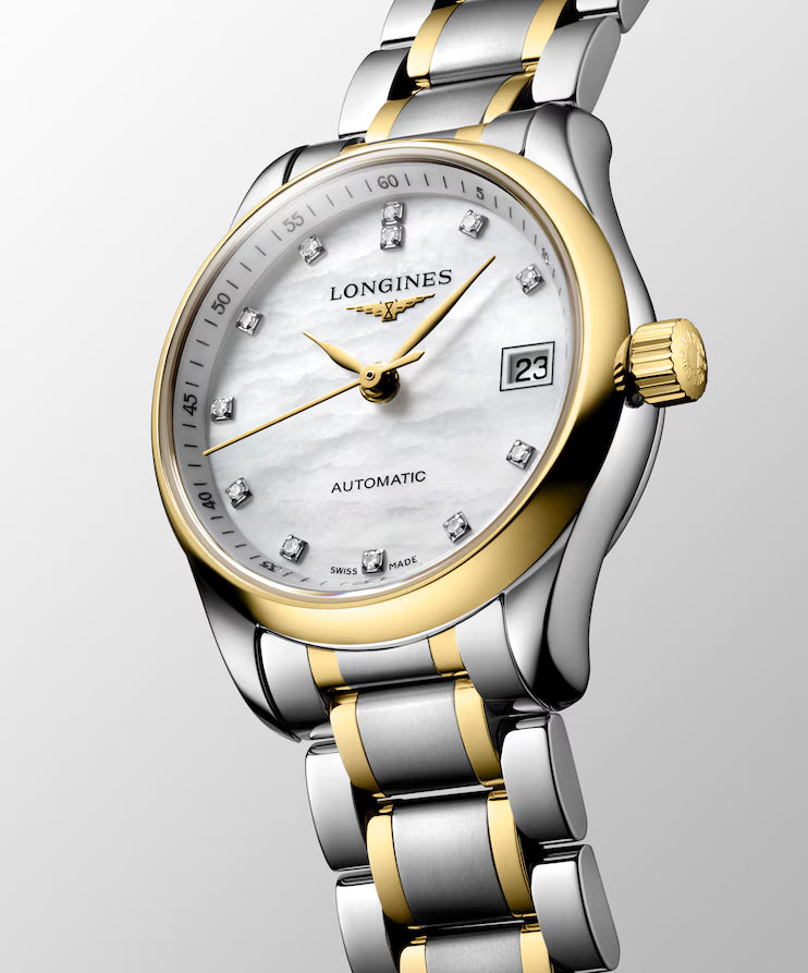 Ladies' Longines Master Collection Automatic Watch. The 25.5mm case and bracelet are bicolour: stainless steel with 18k yellow gold capped bezel and capped centre links. The dial is white mother-of-pearl with twelve diamond set hour markers and a date function. The glass is sapphire crystal and the case back is transparent sapphire crystal glass. The movement is automatic.