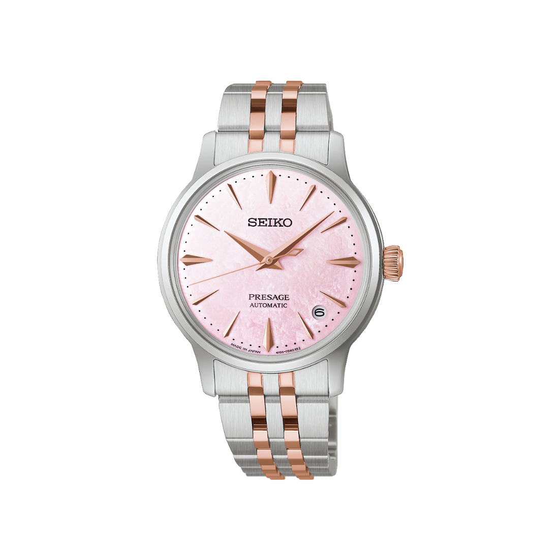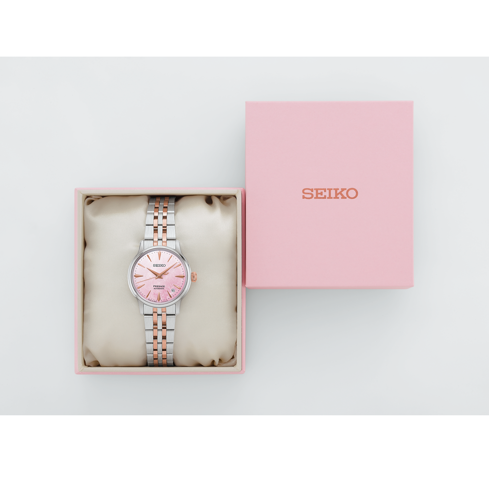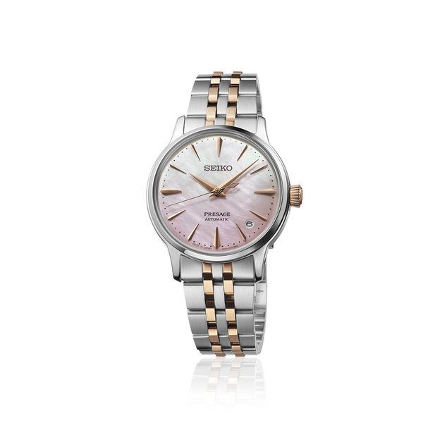 Ladies' Seiko Presage Cocktail Time Limited Edition Automatic Watch. The 34mm case and bracelet are bicolour: rose gold PVD and stainless steel. The dial is pink mother-of-pearl with rose coloured hands and indexes and a date function. The movement is automatic. Presented in a special box. One of 9,000 pieces worldwide.