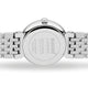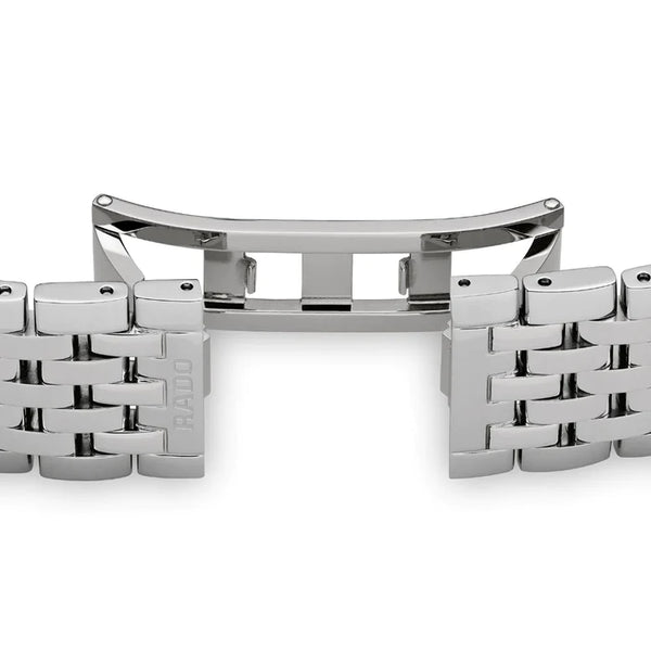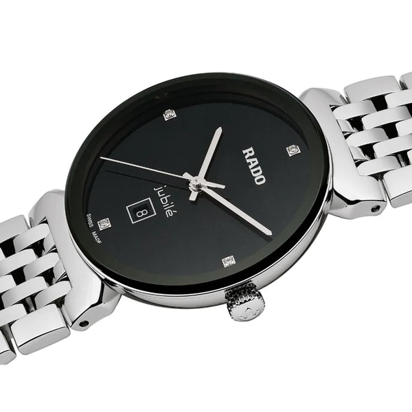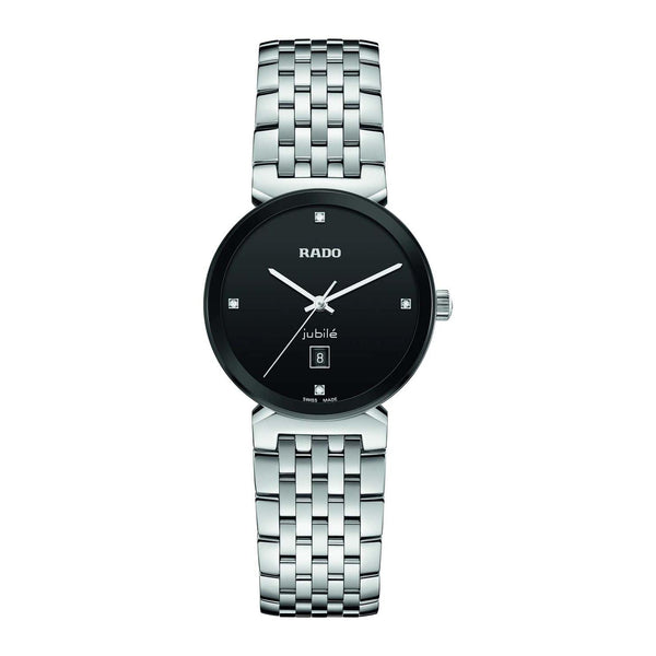 Ladies Rado Florence Classic Quartz Watch. The 30mm case and bracelet are stainless steel. The dial is black with four diamond hour markers and a date display. The glass is sapphire crystal. The movement is quartz.