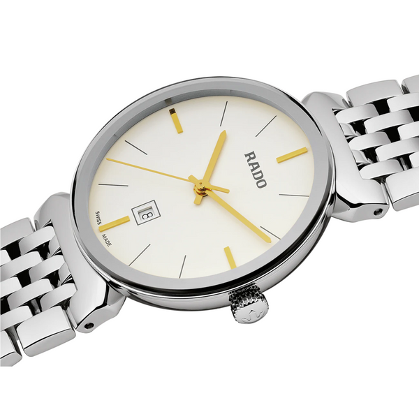Ladies Rado Florence Classic Quartz Watch. The 30mm case and bracelet are stainless steel. The dial is white with gold coloured batons. The watch has a date function at 6 o'clock. The glass is sapphire crystal. The movement is quartz. Currently out of stock.