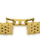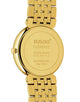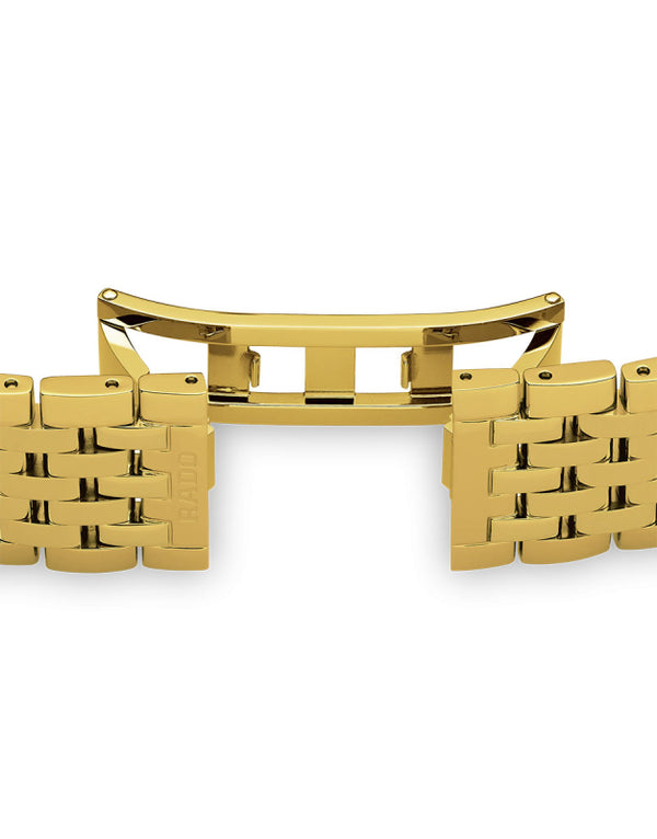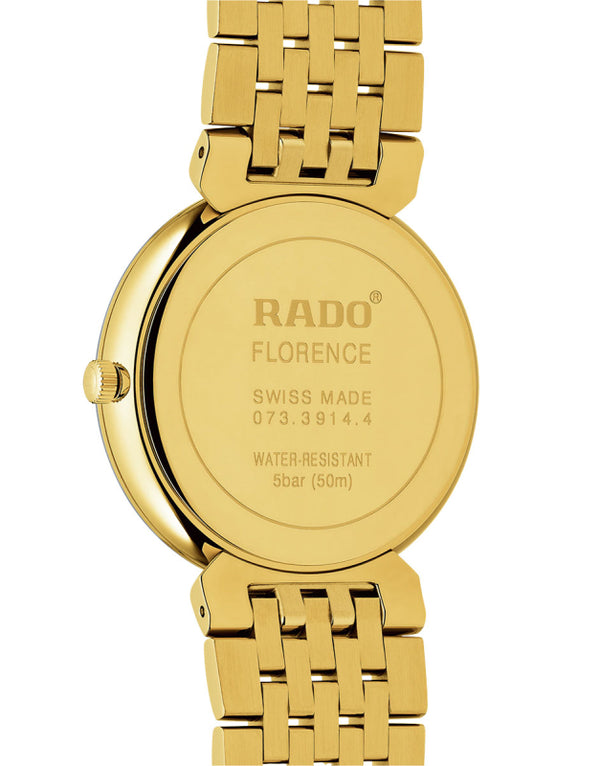 Rado Florence Classic Quartz Watch. The 38mm case and bracelet are yellow gold PVD on stainless steel. The dial is black with four diamond hour markers and a date display. The glass is sapphire crystal. The movement is quartz.