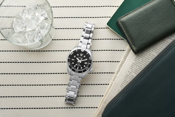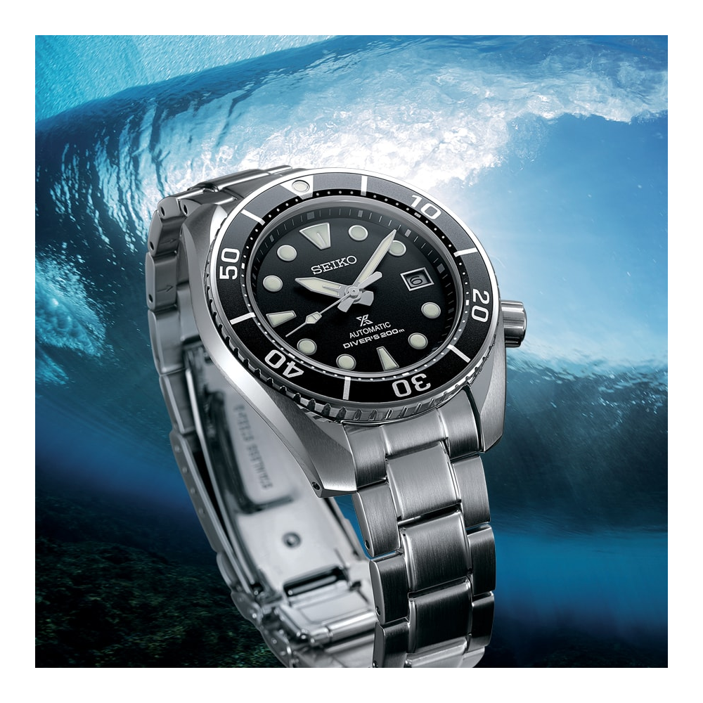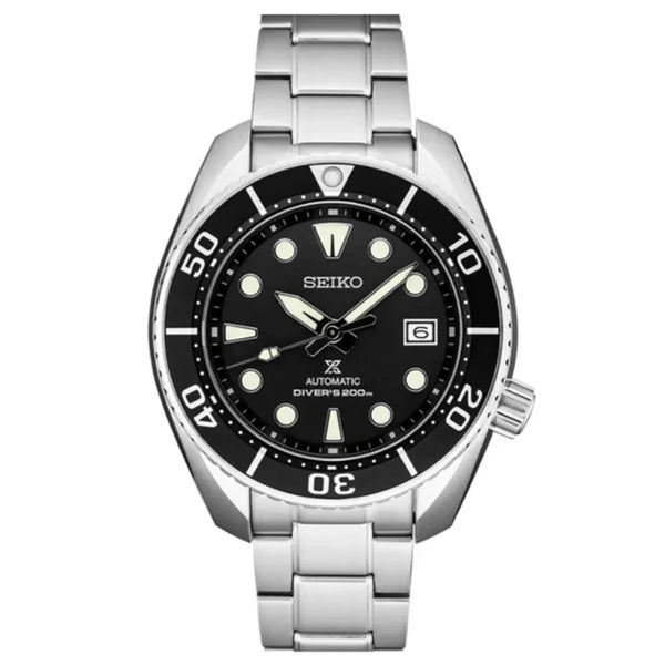Gent's Seiko Prospex Diver's 200m Automatic Watch. The 45mm case and bracelet are stainless steel and the bezel is black. The dial is black with a date function. The glass is sapphire crystal. The watch is 200m water resistant. The movement is automatic. Currently out of stock. Currently out of stock.