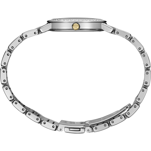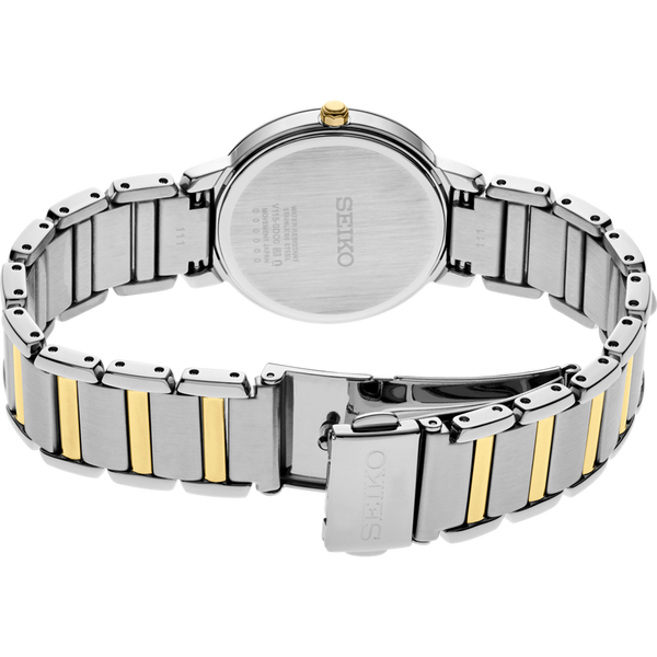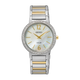 Ladies Seiko Conceptual Yellow Gold PVD on Stainless Steel 30.5mm Case and Bracelet White Mother-of-Pearl Dial Gold Coloured Hands and Indexes Crystal Set Bezel Solar Powered Dress Watch.