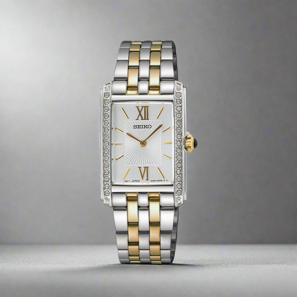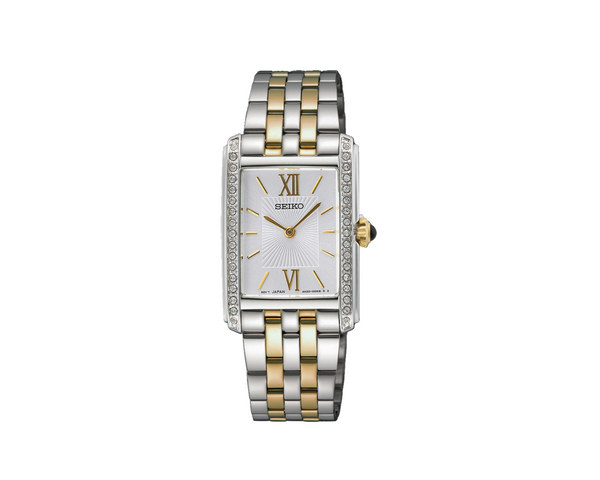 Ladies Seiko Bicolour: Yellow Gold PVD and Stainless Steel Rectangular 22.7 x 33.1mm Case and Bracelet Silver Coloured Dial with Gold Coloured Hands and Indices Bezel set with Crystals Quartz Watch.