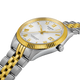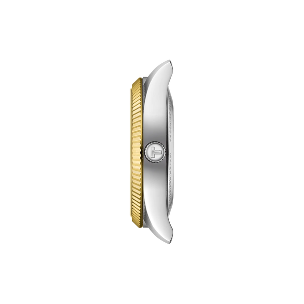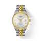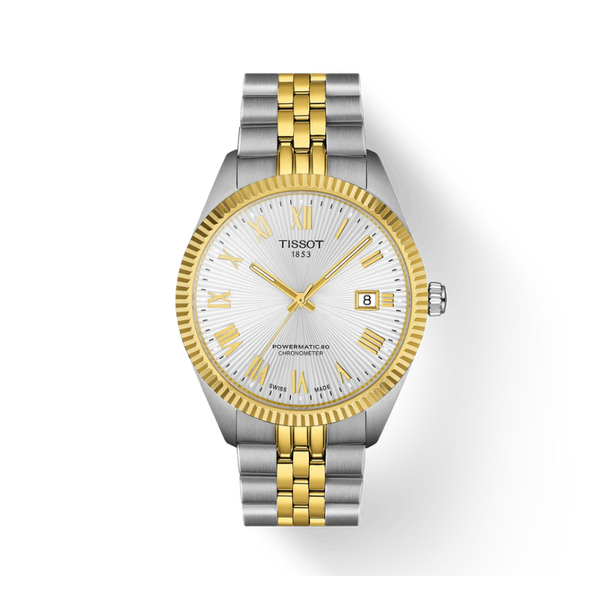Gent's Tissot Ballade Automatic Powermatic 80 Chronometer Watch. The 39mm case and bracelet are bicolour: stainless steel and yellow gold PVD with a yellow gold PVD fluted bezel. The dial is silver with a guilloche pattern and yellow roman numerals. The glass is sapphire crystal. The watch has a see-through case back, date function and is 100m water resistant. The movement is an automatic Powermatic 80 Chronometer.