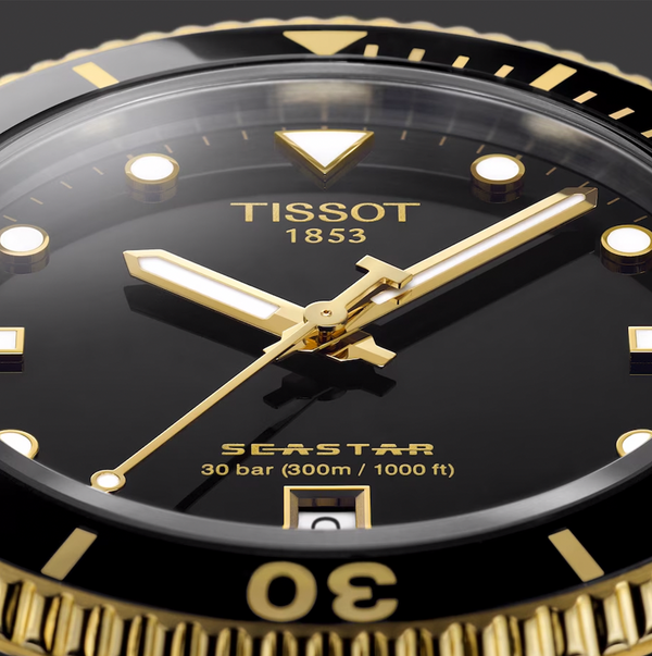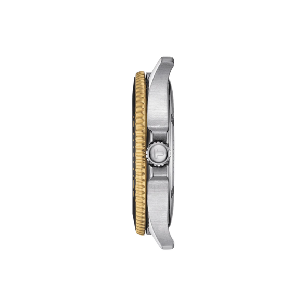 Gent's Tissot T-Sport Seastar 1000 Stainless Steel 40mm Case with Black Rubber Strap Yellow Gold PVD on Stainless Steel Black Bezel Black Dial Date 300m Water Resistant Quartz Watch. Currently out of stock.