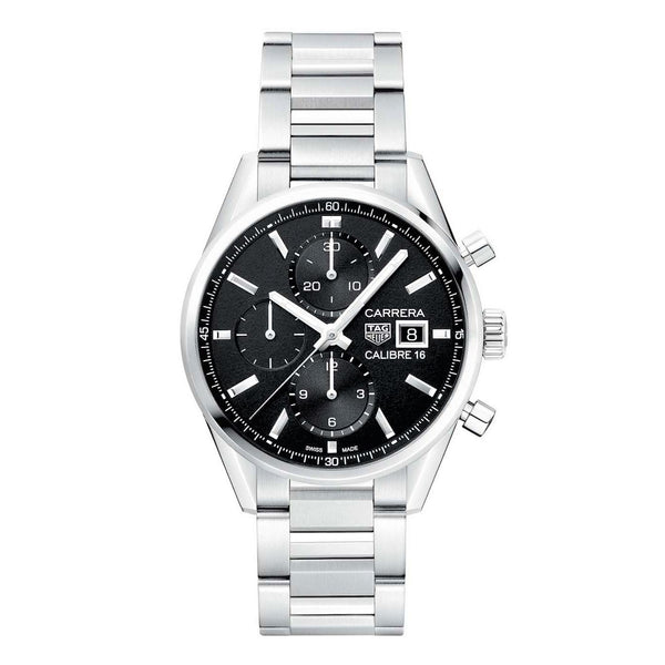 Gent's TAG Heuer Carrera Calibre 16 Automatic Watch. The case and bracelet are stainless steel, the dial is black and the glass is sapphire crystal. The watch features chronograph and day/date functions. The movement is calibre 16 automatic. Currently out of stock but a new piece is expected to arrive instore soon.