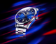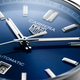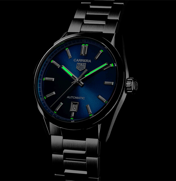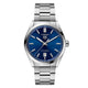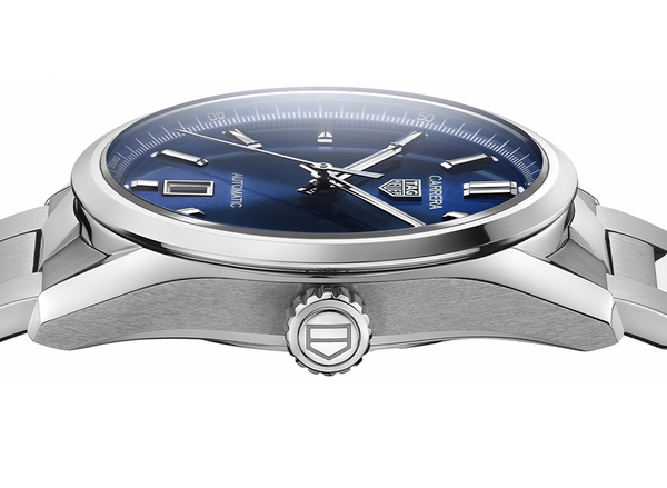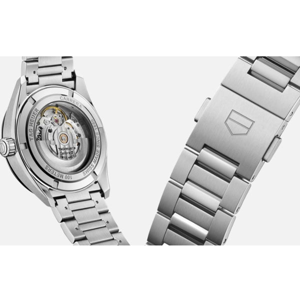 Gent's TAG Heuer Carrera Automatic Watch. The 39mm case and bracelet are stainless steel, the dial is blue and the glass is sapphire crystal. The watch features a date function and has a transparent sapphire crystal case back. The movement is Calibre 5 automatic.