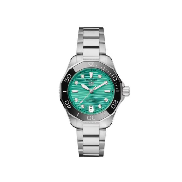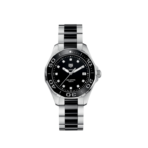 Ladies' TAG Heuer Aquaracer 35mm Watch. The case and bracelet are bicolour stainless steel and black ceramic links/bezel, the dial is black and the glass is sapphire crystal. The watch features a diamond set dial and date function. The watch is 300 metres water resistant and the movement is quartz.