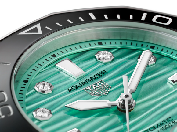 Close-up of a Tag Heuer watch face with blue and black accents.
