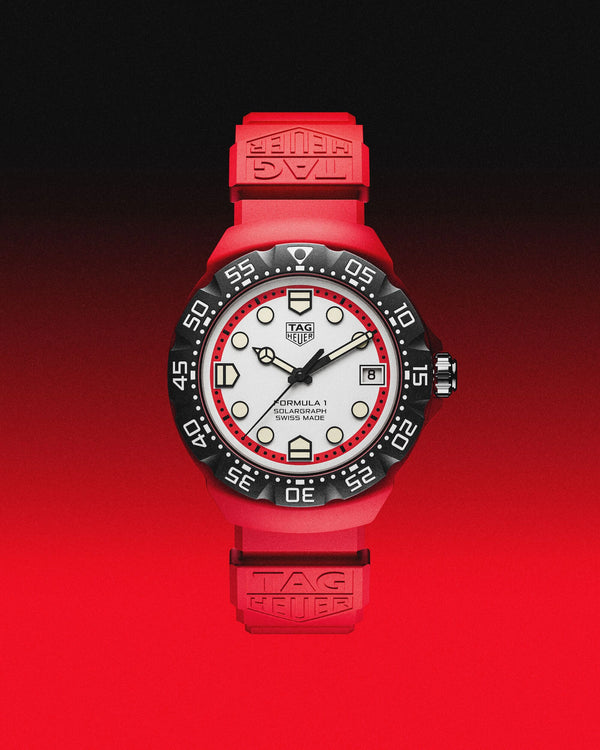 Gent's TAG Heuer Formula 1 Solargraph Watch. The 38mm case and bezel are red TH-Polylight with a red rubber strap. The white opalin dial has a red inner flange with white hands and indexes. The glass is sapphire crystal. The watch features a date function and is 100m water resistant. The movement is a Calibre TH50-00 Solar Quartz.