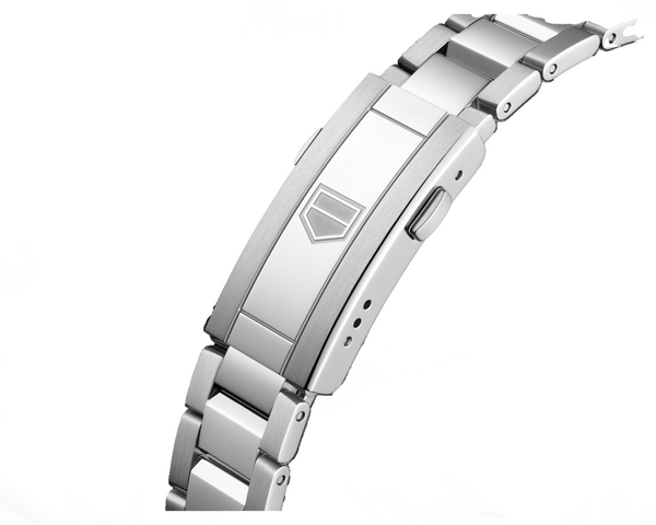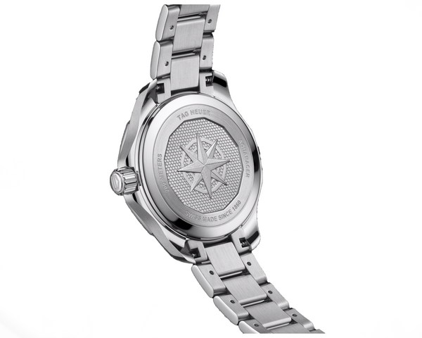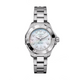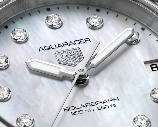 Ladies TAG Heuer Aquaracer Solargraph Watch. The 34mm case and bracelet are stainless steel, the dial is white mother-of pearl with diamond set hour markers. The movement is a solargraph. The watch is 200 metres water resistant.