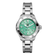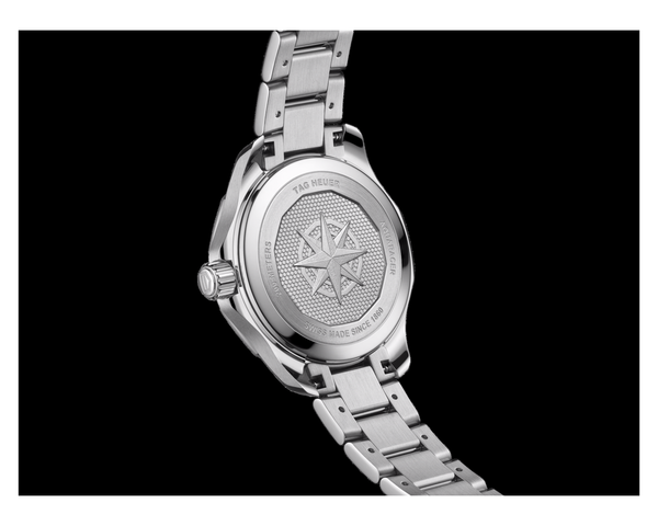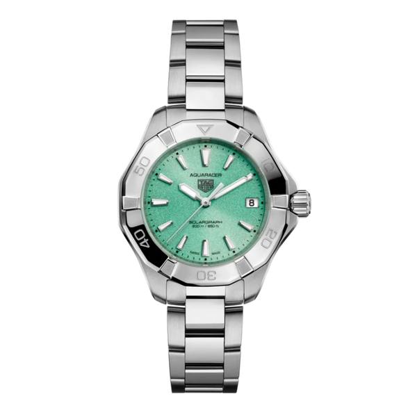 Ladies TAG Heuer Aquaracer Professional 200 Solargraph Watch. The 34mm case, bracelet and bezel are stainless steel. The dial is "polar blue" in colour. The glass is sapphire crystal. The watch has a date function and is 200 metres water resistant. The movement is solar powered, Calibre TH50-01 quartz movement.