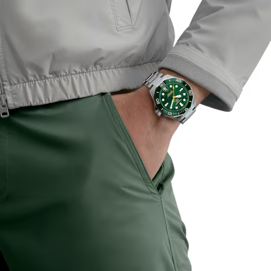 TAG Heuer Aquaracer Automatic Chronometer Watch. The 42mm case and bracelet are stainless steel, the bezel is green ceramic, the dial is green with a date display, and the glass is sapphire crystal. The watch is 300 metres water resistant and the movement is a calibre TH31-00 automatic chronometer. Five year TAG Heuer warranty. Currently out of stock but a new piece is expected to arrive instore soon.