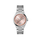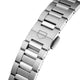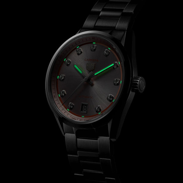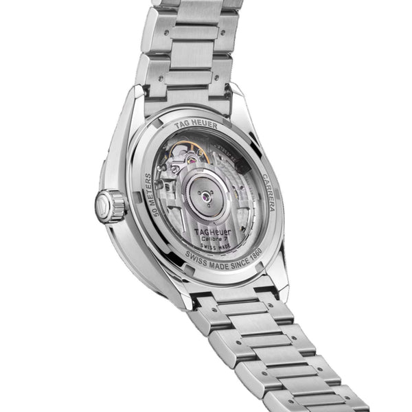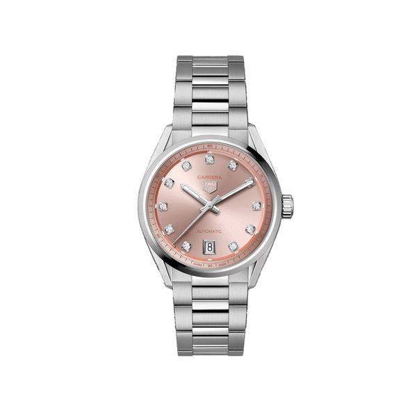 Ladies TAG Heuer Carrera Automatic Watch. The 36mm case and bracelet are stainless steel. The dial is pink with eleven diamond set hour markers and an inner flange with seconds markers. The glass is sapphire crystal and the case back is transparent with a sapphire crystal glass. The watch has a date function. The movement is a Calibre 7 automatic.