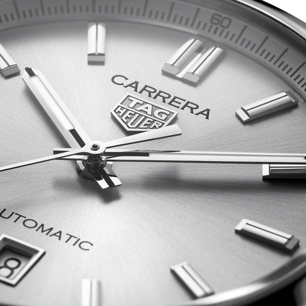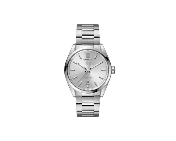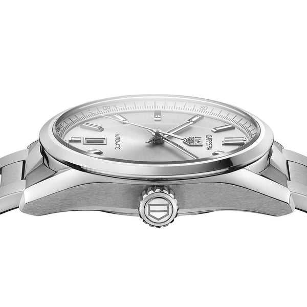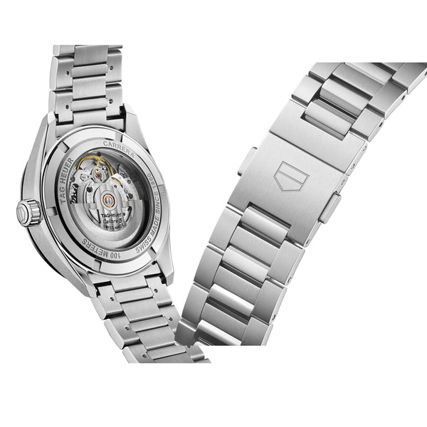 Gent's TAG Heuer Carrera Automatic Watch. The 39mm case and bracelet are stainless steel, the dial is silver and the glass is sapphire crystal. The watch features a date function and has a transparent sapphire crystal case back. The movement is Calibre 5 automatic. Currently out of stock.