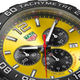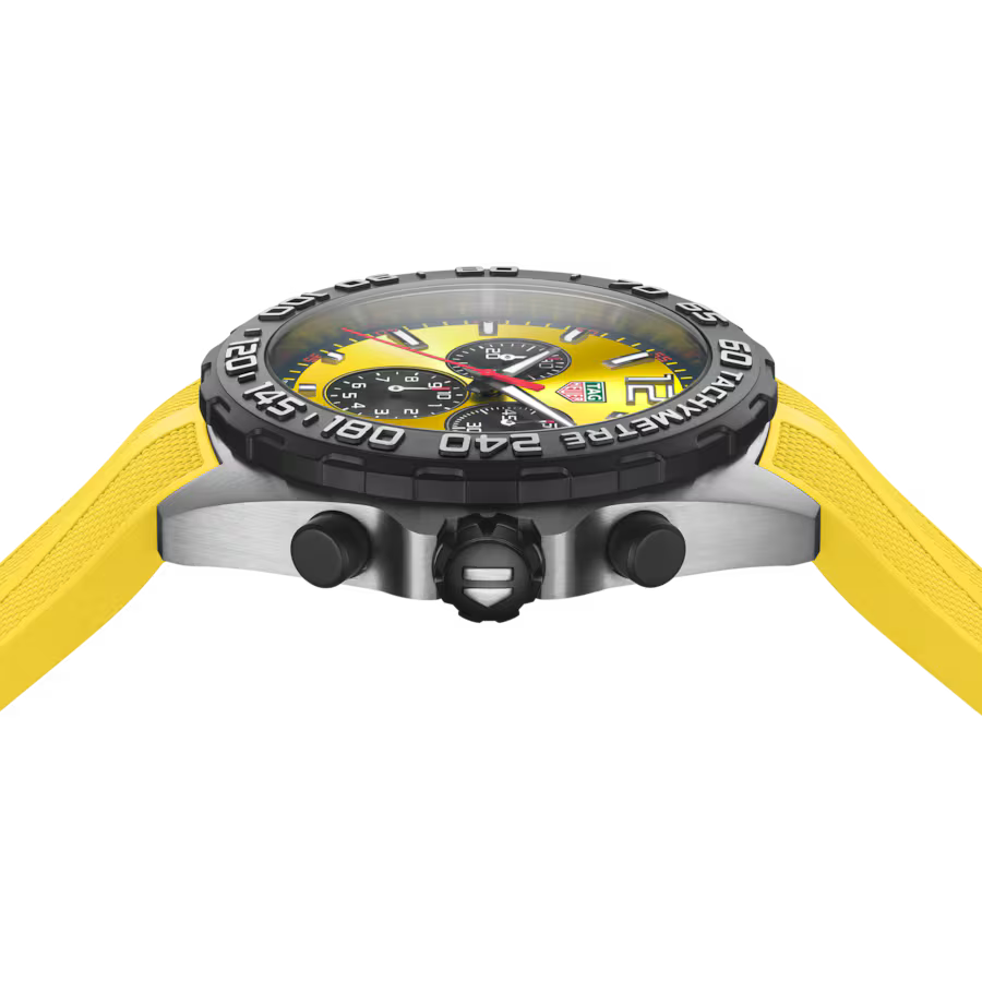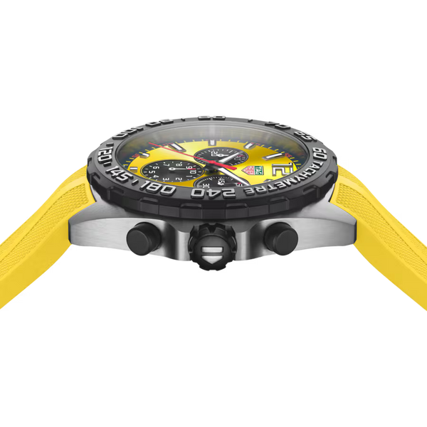 Gent's TAG Heuer Formula 1 Chronograph Quartz Watch. The 43mm case is stainless steel with a yellow rubber strap. The dial is yellow with black sub dials and red accents. The bezel is black PVD on stainless steel with a tachymetre. The glass is sapphire crystal. The watch features chronograph and date functions and is 200 metres water resistant. The case back has a chequered race flag motif. The movement is quartz.