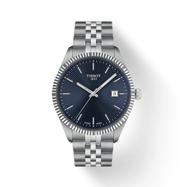 Gent's Tissot Ballade Stainless Steel 40mm Case and Bracelet with Fluted Bezel Blue Guilloche Patterned Dial Sapphire Crystal Glass Date 100m Water Resistant Quartz Watch.