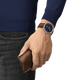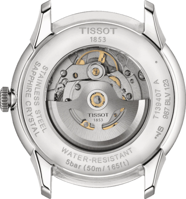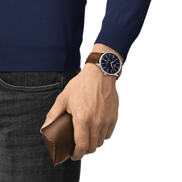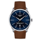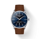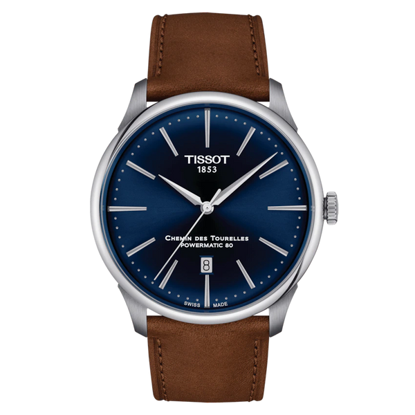 Gent's Tissot Chemin Des Tourelles Powermatic 80 Watch. The 42mm case is stainless steel. The strap is brown leather with a deployment clasp. The dial is blue with a date function and the glass is a domed sapphire crystal. The watch has a see-through case back. The movement is an automatic Powermatic 80 with a nivachron balance spring. Currently out of stock but available to order.